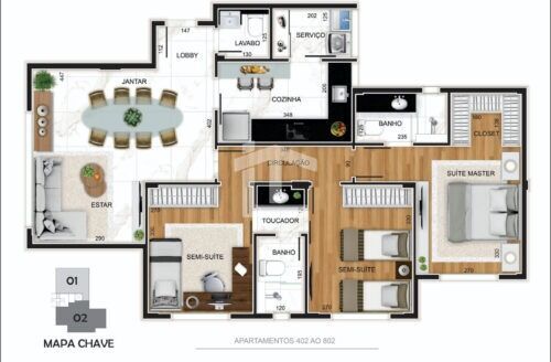 Os apartamentos, com 2 ou 3 quartos, contam com plantas bem distribuídas de 61m² e 83m², respectivamente. As unidades de 2 quartos oferecem 1 suíte com closet, enquanto os de 3 quartos possuem 1 suíte com closet, 2 semi suítes e lavabo.