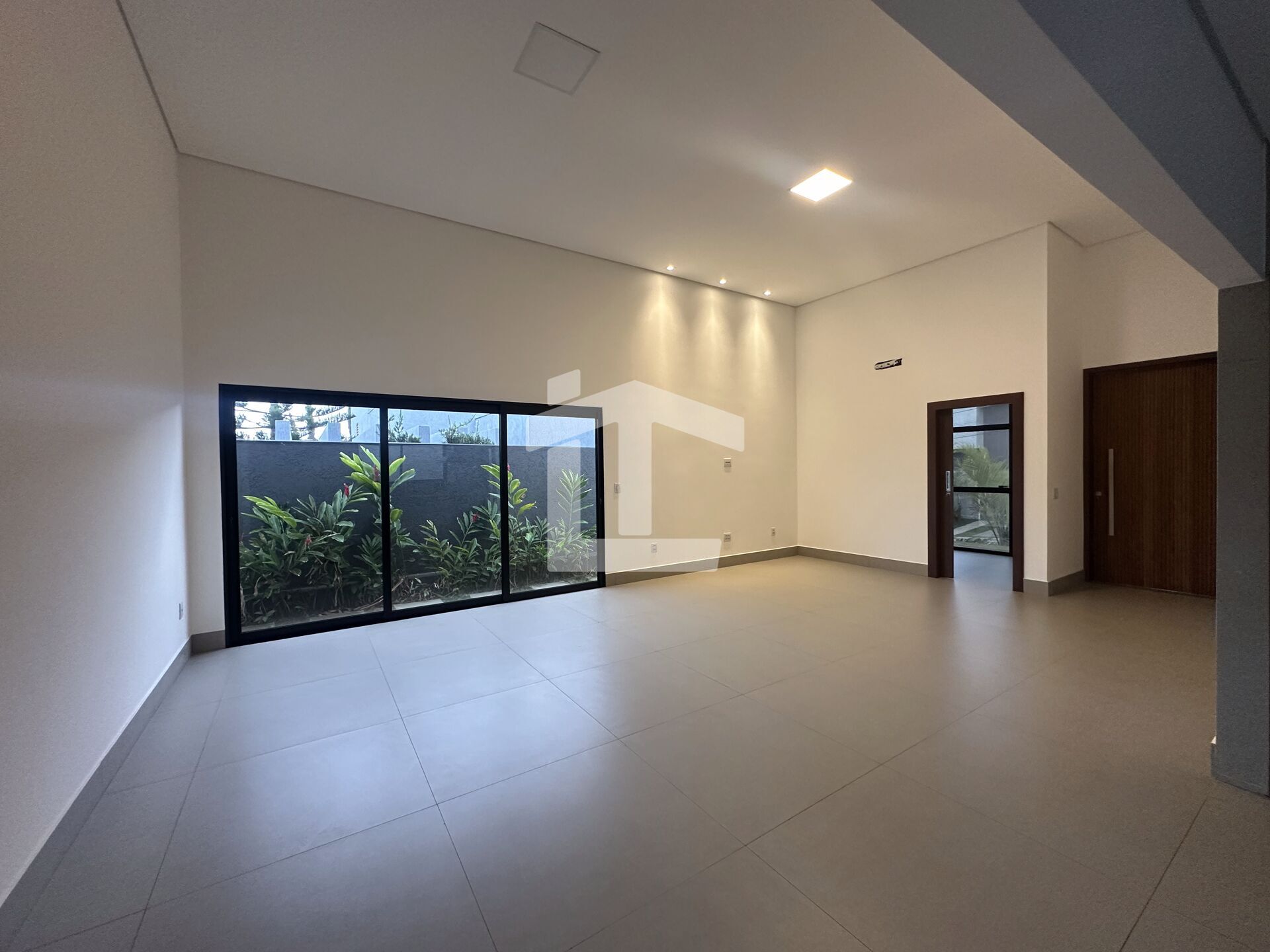 - Sala ampla com pé-direito elevado, porcelanato 90x90cm e rebaixamento em gesso.
